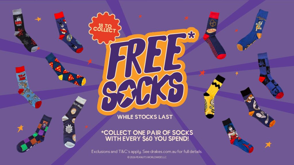 Spend $60 or more in one transaction at any Drakes Supermarkets to receive a FREE pair of socks. There are 18 to collect – Promotion runs from Wednesday 7th January until 11:59 ACDT Tuesday 17th February 2026, or while stocks last.